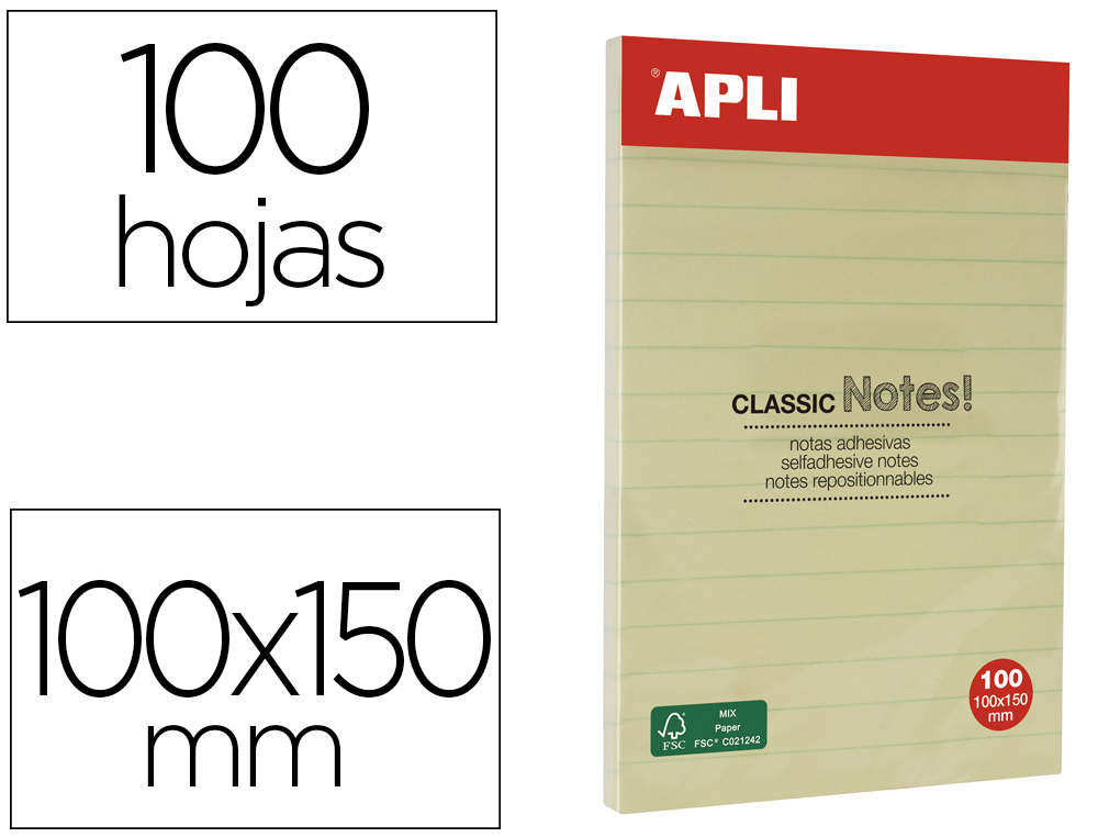 Bloc de notas adhesivas quita y pon apli 150x100 mm rayado amarillo con 100 hojas